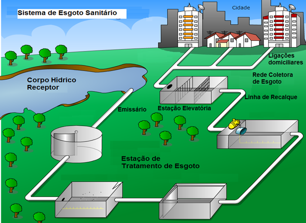 O esgoto doméstico (banheiros, pias, ralos, chuveiros) é conduzido por redes subterrâneas até uma Estação de Tratamento de Esgoto (ETE) ou até uma solução local, onde é tratado para remoção de contaminantes antes do descarte final.